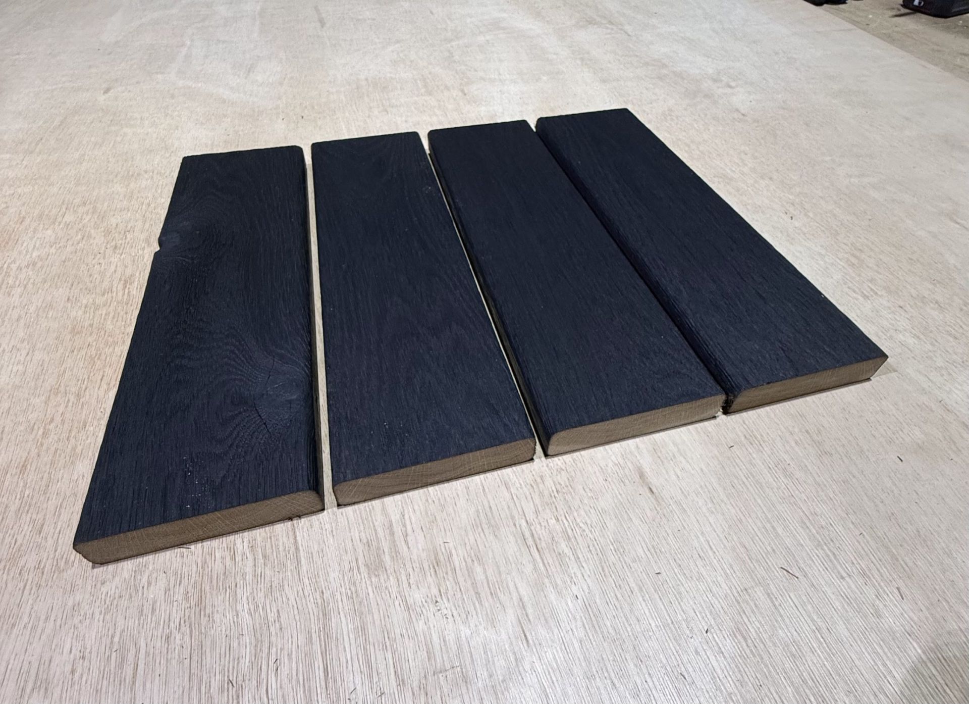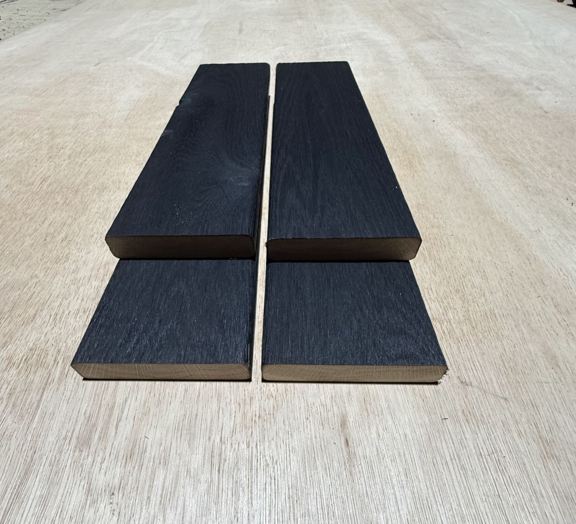 Charred Oak Decking Boards | Deep Black are crafted from high-quality oak hardwood and finished using the traditional Shou Sugi Ban charring process. This technique creates a rich, deep black surface while improving the timber’s natural durability, stability and resistance to weathering.